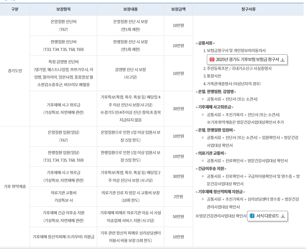 온열질환은 물론 한랭질환, 특정 감염병 등에 대해서도 보장이 가능하니 확인하시길 추천드립니다. 경기도에서 도민을 위하여 만든 제도이니 알아두시길 바랍니다.