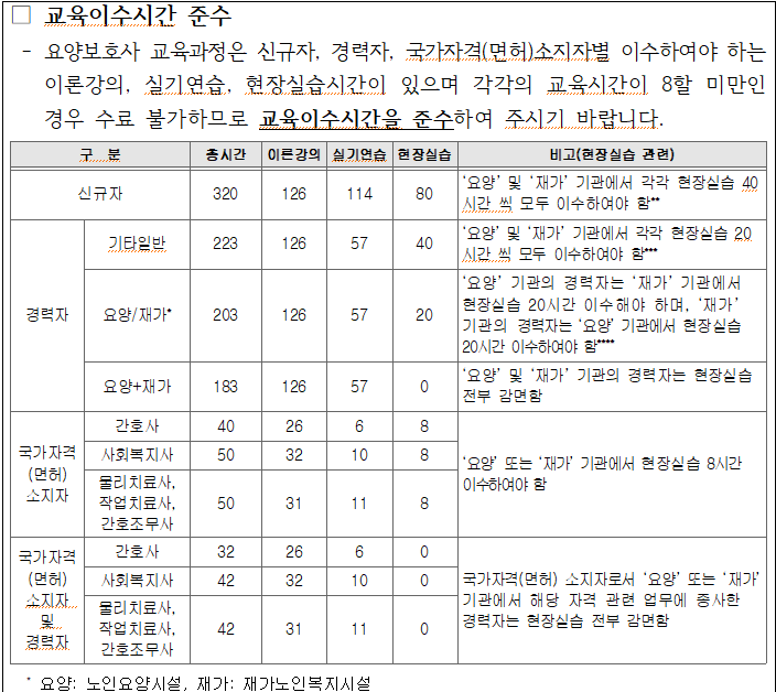 간호사, 간호조무사, 사회복지사 자격이 있는 경우에는 교육 면제 혜택이 있습니다.(아래의 표 참조)